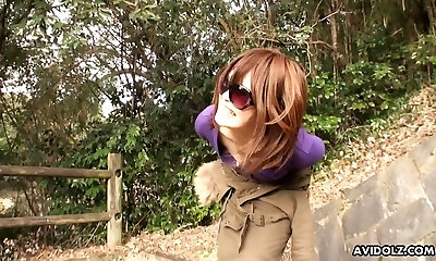 Kinky brunette Jade Kimiko teases outdoors and gets smashed