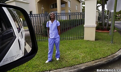 Bi-racial plumbing in the van with cute ebony nurse Lexxi Deep