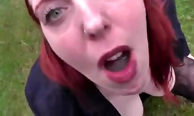 Redhead Deutsch cougar works that big cock with her ass and jaws in the park