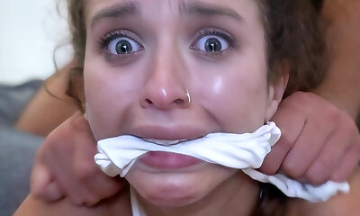 A bit plump pale brunette gets mouthfucked hard by masked horny men
