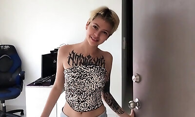 Tattooed blonde sucks his cock hard then sticks it up her beaver